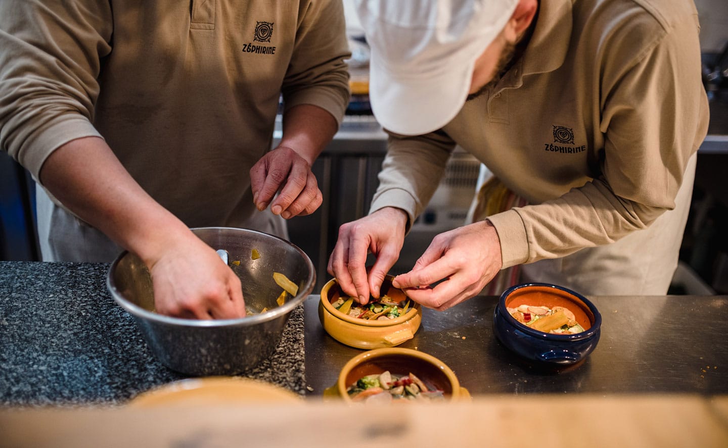 Pas de « chichi » ! On écoute, on observe, on partage, on goûte, on échange, on apprend les recettes et astuces avec le chef… Chez Zéphirine, grâce à la table de tranche, la cuisine est au cœur du service et le client est au cœur de la cuisine : les codes du restaurant sont bousculés pour une expérience gastronomique participative différente !